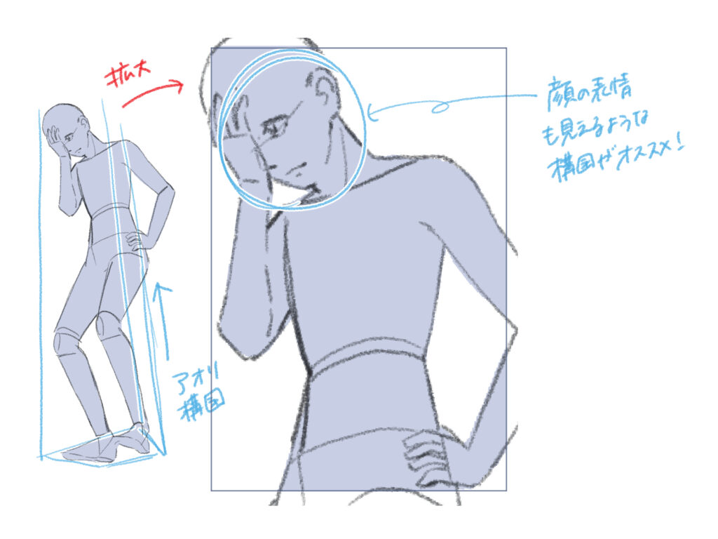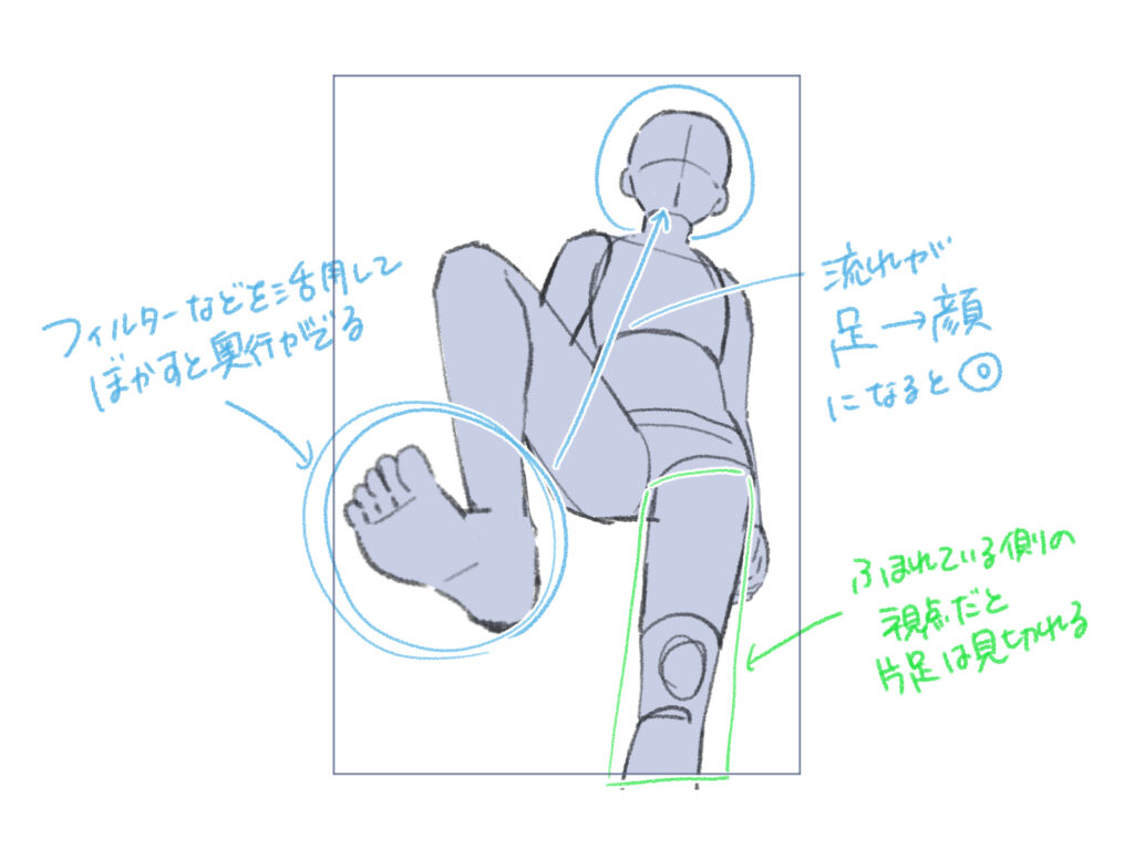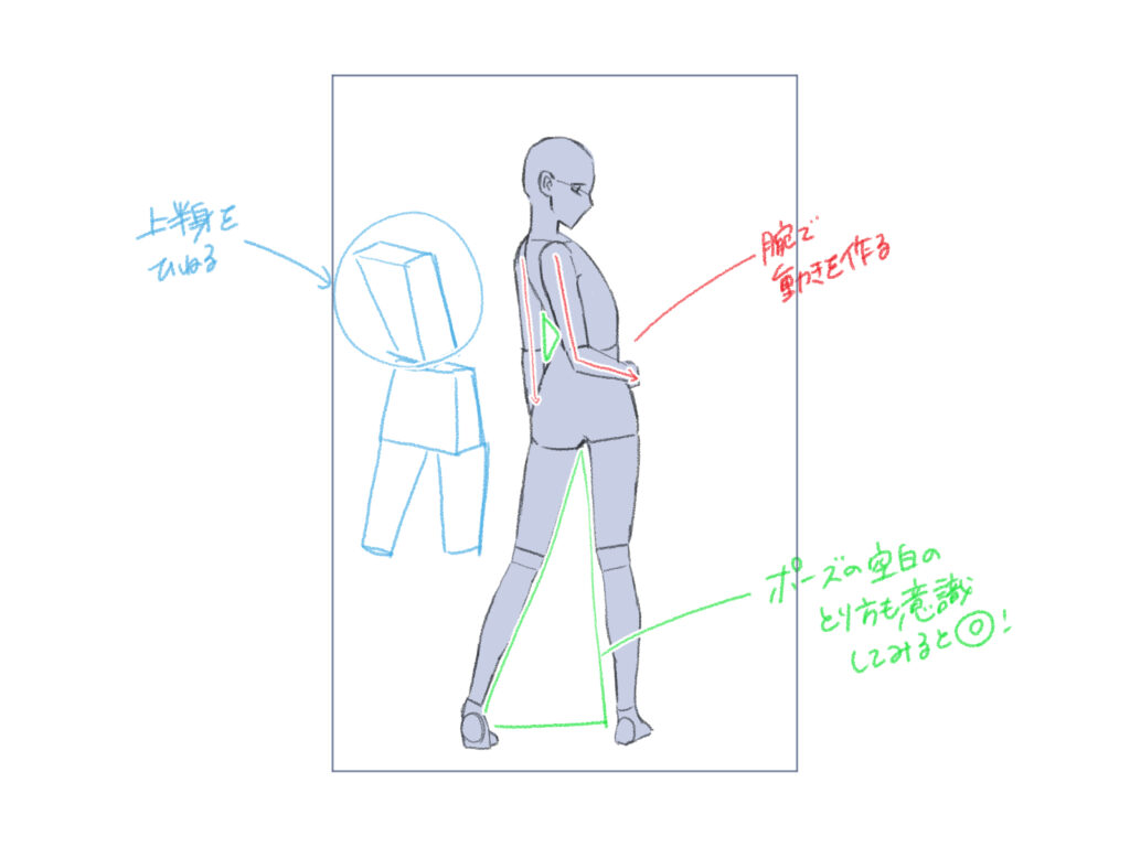 前かがみのポーズを描く際は、三角形構図で目立たせたいポイントをはっきりと収めましょう。また、思い切って体の一部を画面から切り取ることで、視覚的に興味深い構図になります。