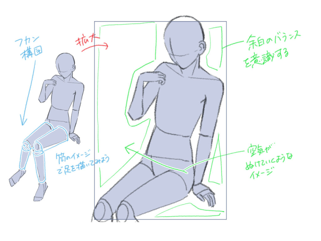 座っているポーズではフカンまたはアオリの視点を利用すると画面に奥行きを出せます。片足を折り曲げたり、脚を絡ませたりすると動きが生まれ、魅力的なイラストになります。