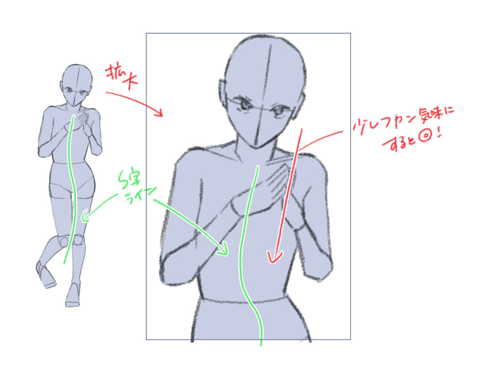 上目遣いの立ちポーズでは、あざとく可愛い印象を与えるため、フカン構図(上から見下ろす視点)で描くと効果的です。さらに、体のラインをS字状にすると動きが出て魅力的になります。また、目元に視線が集まるように、腰や肩から上を中心に描くと、キャラクターの表情が際立ちます。