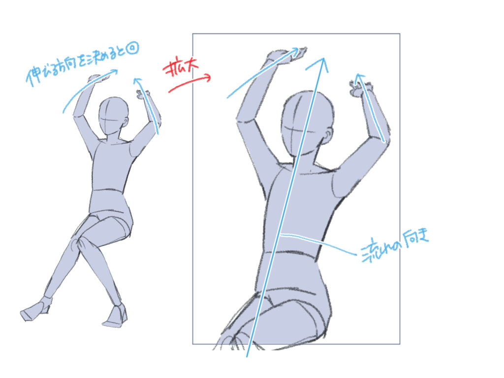 伸びるポーズを描く際は、手や腕を伸びる方向に明確に向けることで、動きに説得力が生まれます。全身を描いてもよいですが、腰から上を中心に描いても伸びる動きは十分伝わります。