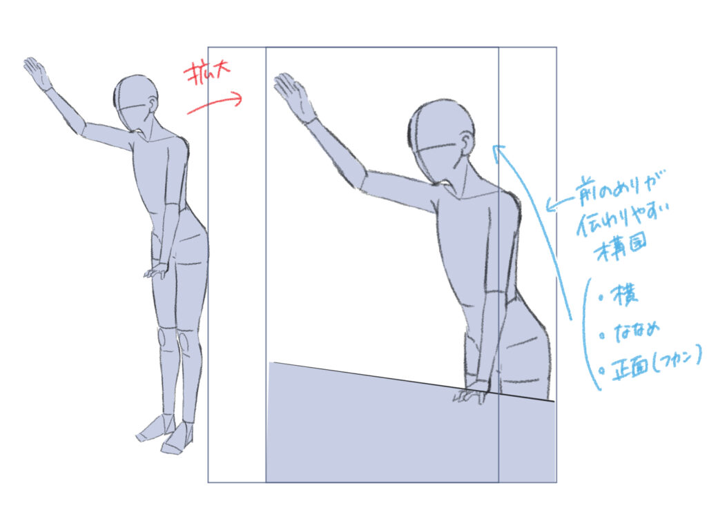 前のめりのポーズを描く時は、斜めや横からの視点で描くと動きが明確になり、前のめり感が強調されます。正面から描く場合は少し難易度が高いですが、フカン構図を使うとパースが効いて、前のめりの迫力が伝わりやすくなります。