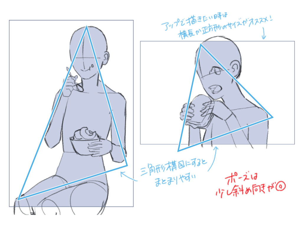 立ちポーズで魅力的な構図を描くには、三角形構図や三分割構図がおすすめです。それぞれのポイントを詳しく解説します。