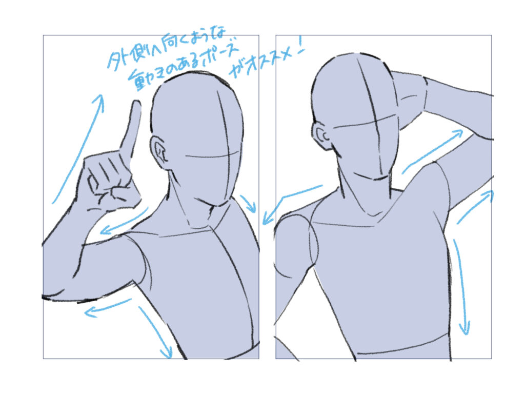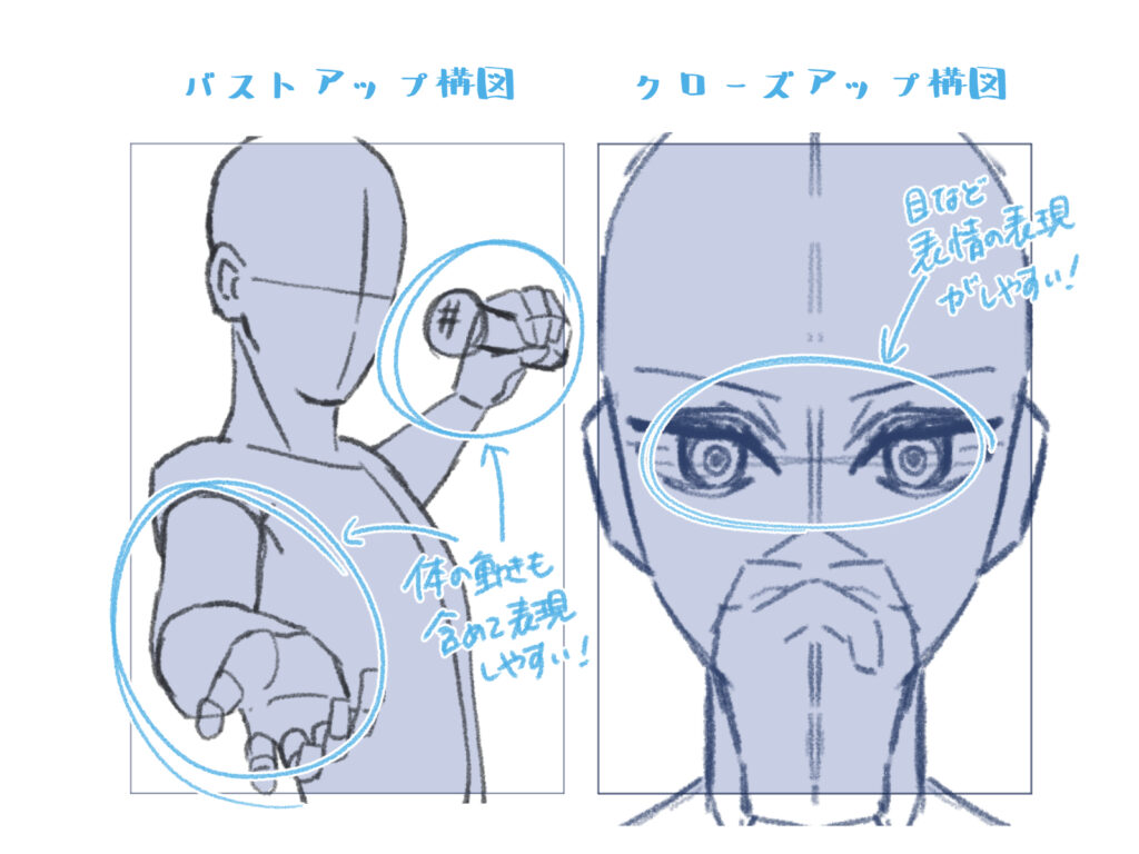 そのため、表情を特に強調したい場合はクローズアップ構図、動きやポーズを含めて描きたい場合はバストアップ構図が適しています。
