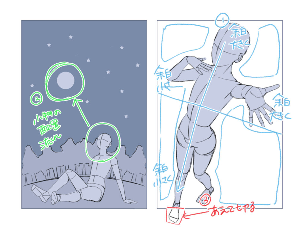 動きのあるポーズを描くときは、足の位置や動きを工夫することで躍動感が生まれます。さらに、俯瞰やあおりの視点を取り入れると、奥行きのあるダイナミックな構図に仕上がります。他にも、髪や服をなびかせることで空間に変化を与え、より豊かな動きを表現できます。
