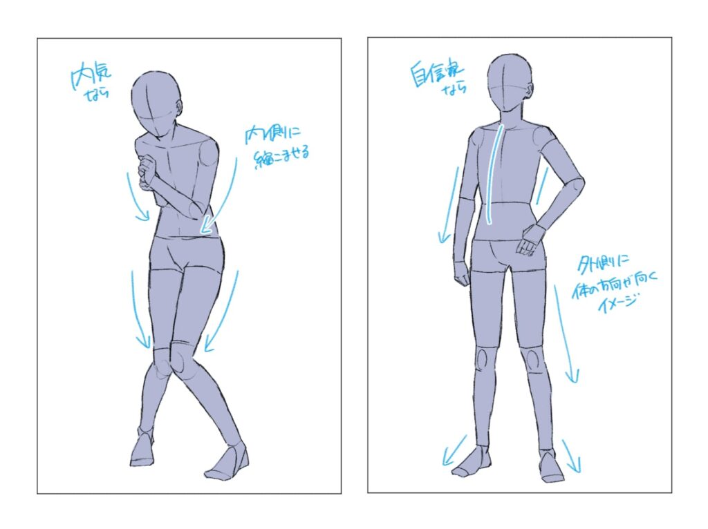 キャラクターの個性はポーズやシルエットで効果的に伝えることができます。内気な性格なら体を小さく縮こませ、自信に溢れた性格なら胸を張って外に開くようなポーズを取り入れることで、キャラクターの性格が一目で伝わる魅力的なイラストになります。