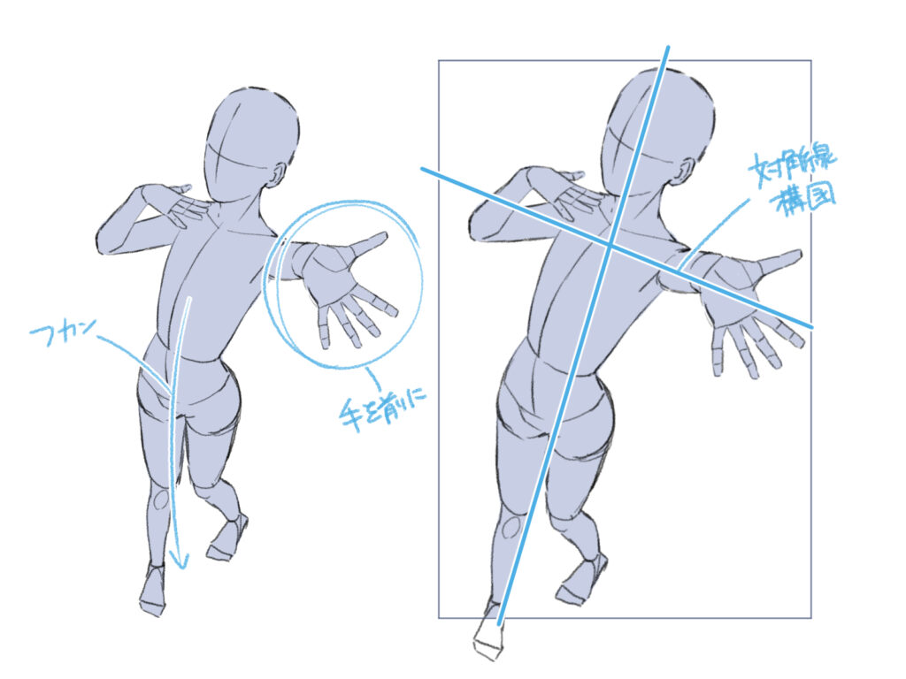迫力あるアクションを描くには対角線構図が最適です。体の中心から手足を思い切り広げるポーズを取り入れたり、フカン構図を活用したりすると、動きや躍動感が強調され、インパクトのあるイラストに仕上がります。