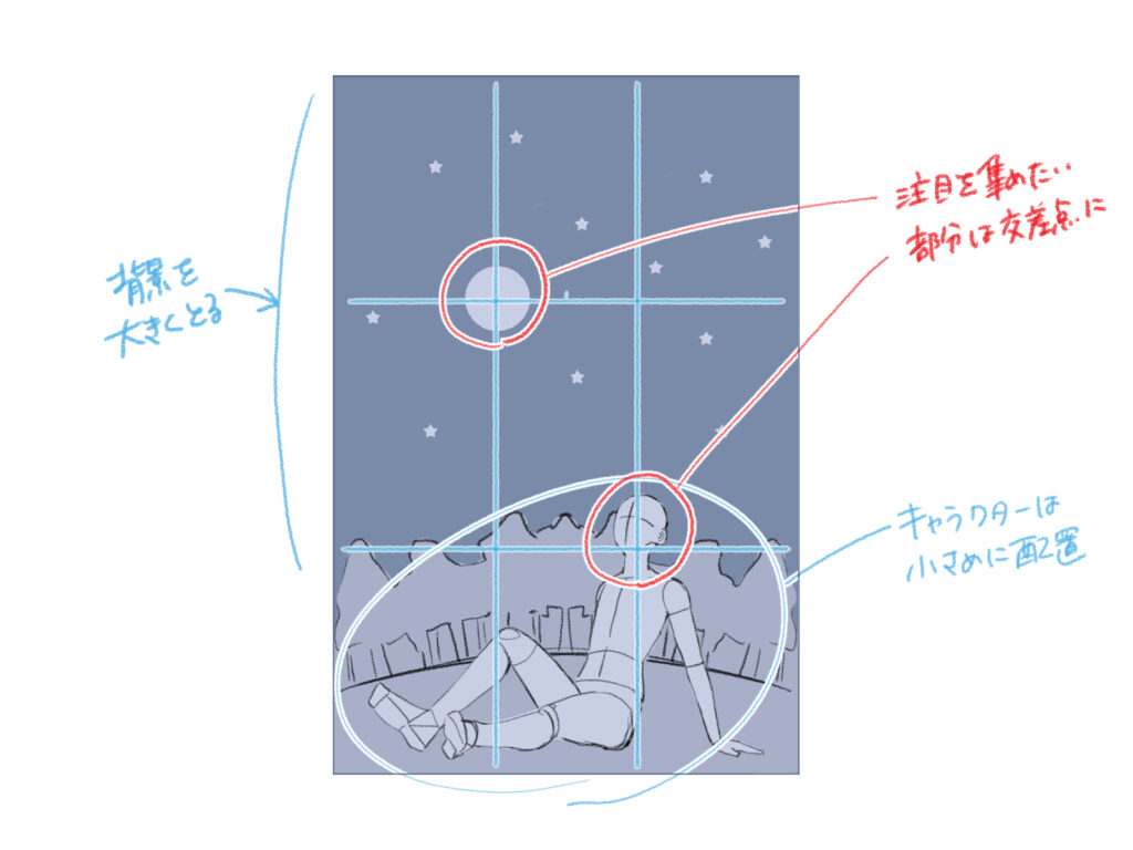 キャラクターを背景や世界観に溶け込ませたい場合は、背景の面積を広く取り、人物を小さく配置するのが効果的です。また三分割構図を活用すると、自然と視線誘導が生まれ、主役と背景が調和した魅力的な構図になります。