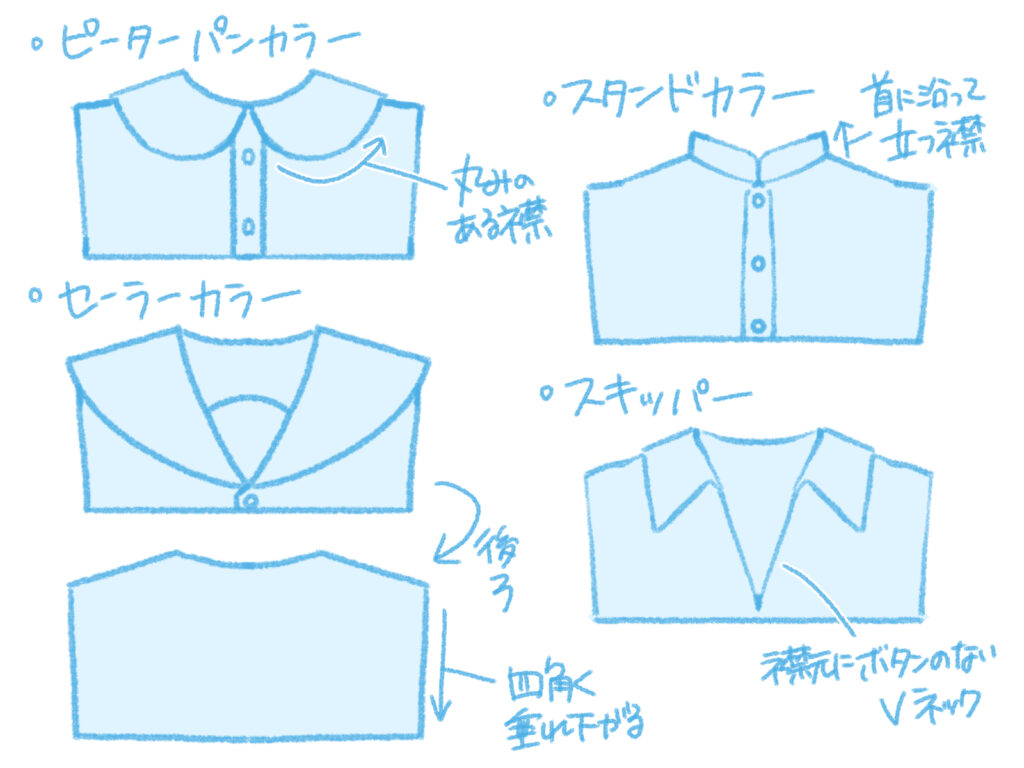 • セーラーカラー:水兵の制服に由来するデザインの大きな襟です。女子学生の制服としても人気です。