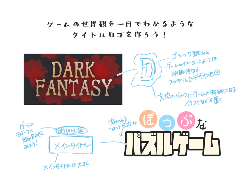 ロゴを一目見ただけで、どのようなゲームなのかが伝わるデザインが理想です。