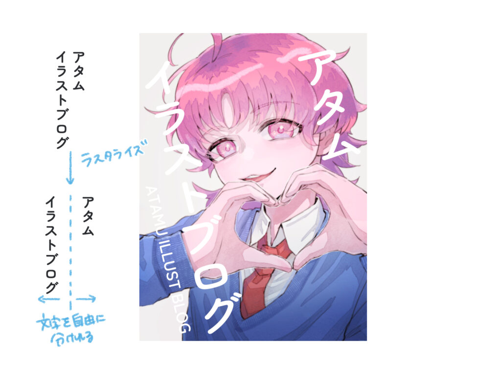 文字を画像データに変換する「ラスタライズ」を使うと、自由な位置に文字を配置できます。クリップスタジオの場合、「レイヤー」の項目からラスタライズできます。