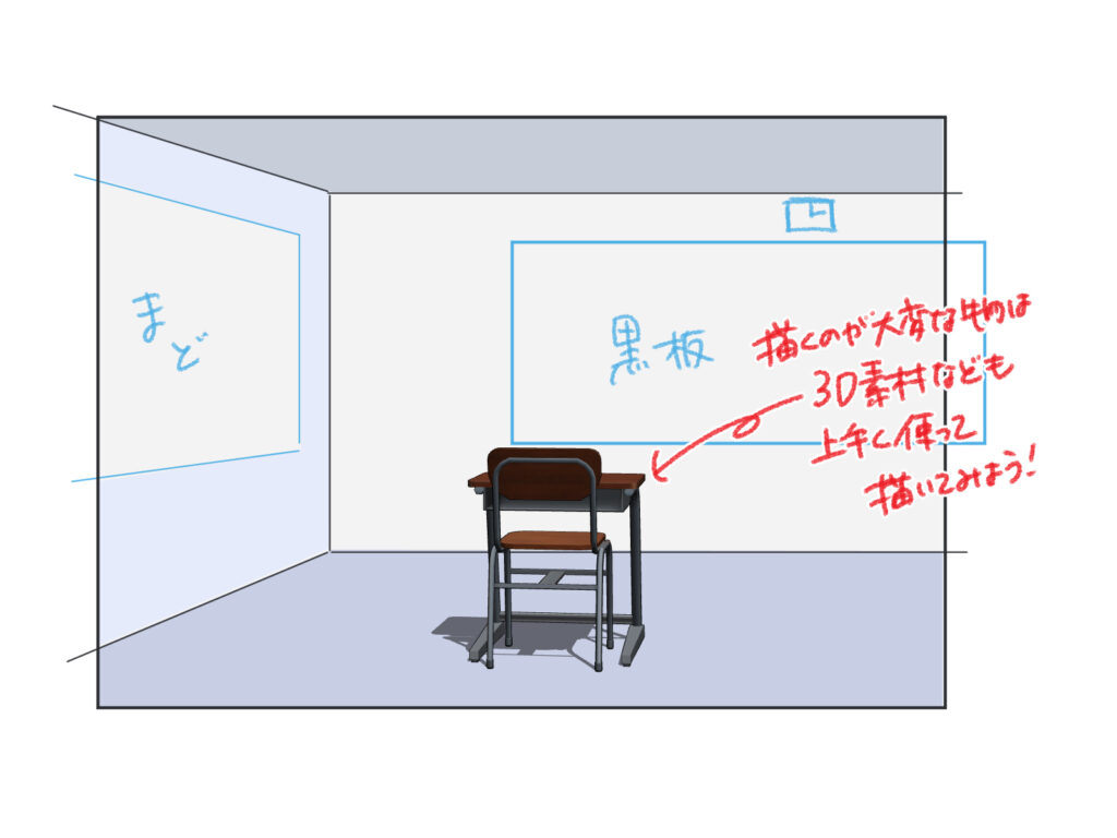 教室の背景イラストでは、「窓」「廊下」「黒板」「机と椅子」が必須の要素になります。特に、机や椅子のように同じ形状のものを多数配置する場合は、ペイントアプリの3D素材などを活用すると、パース(遠近感)を正確に保ちながら効率的に描けます。