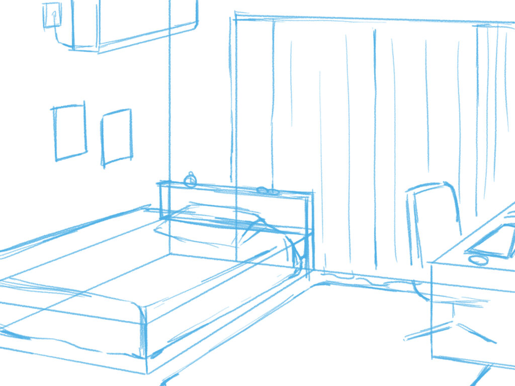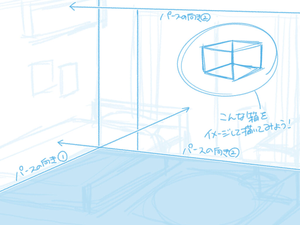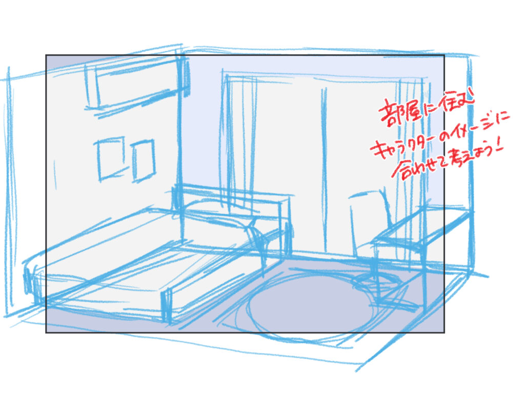 パース(遠近法)を意識し、まず部屋全体を大きな箱として捉え、その中に家具を小さな箱として配置していくと、構図が決めやすくなります。