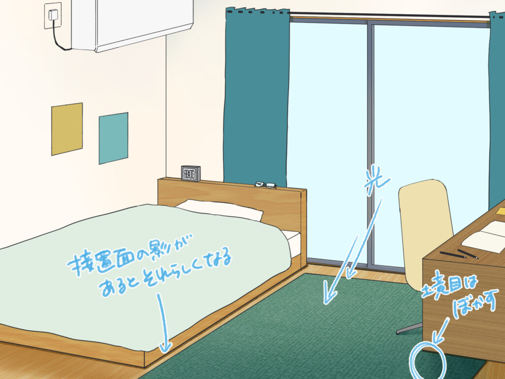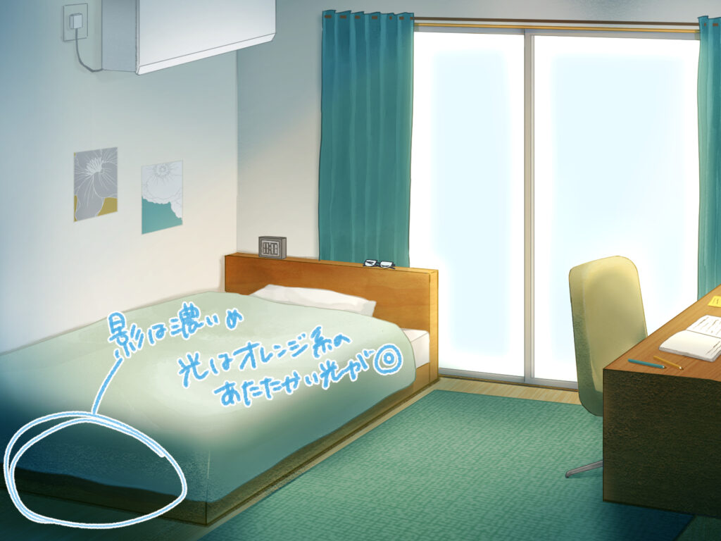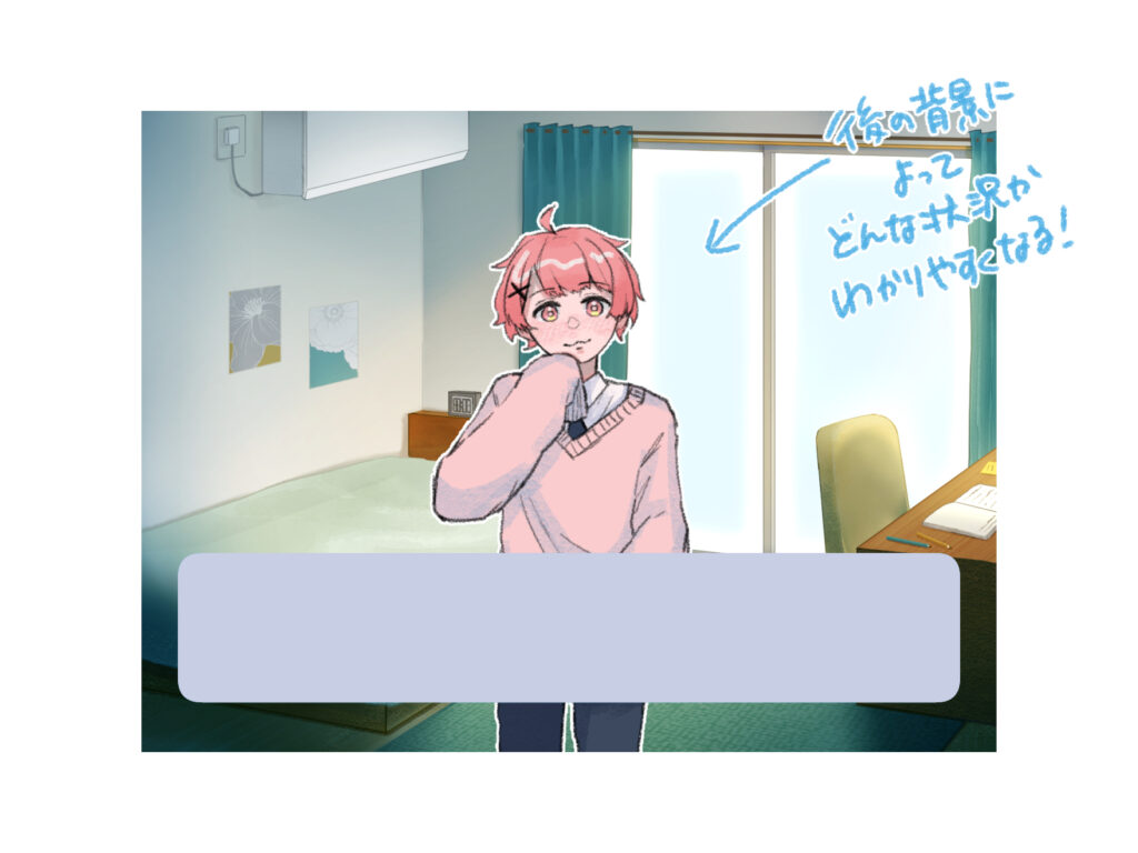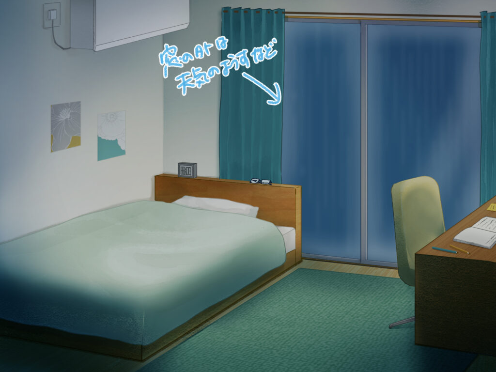 同じ部屋の背景でも、色使いや描き込みを調整するだけで、異なる時間帯や天候を表現でき、物語の演出に幅が生まれます。