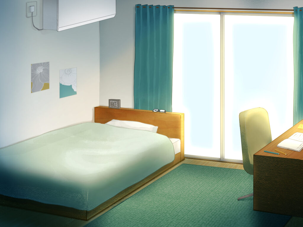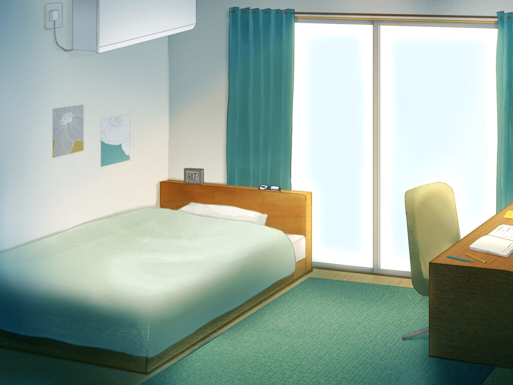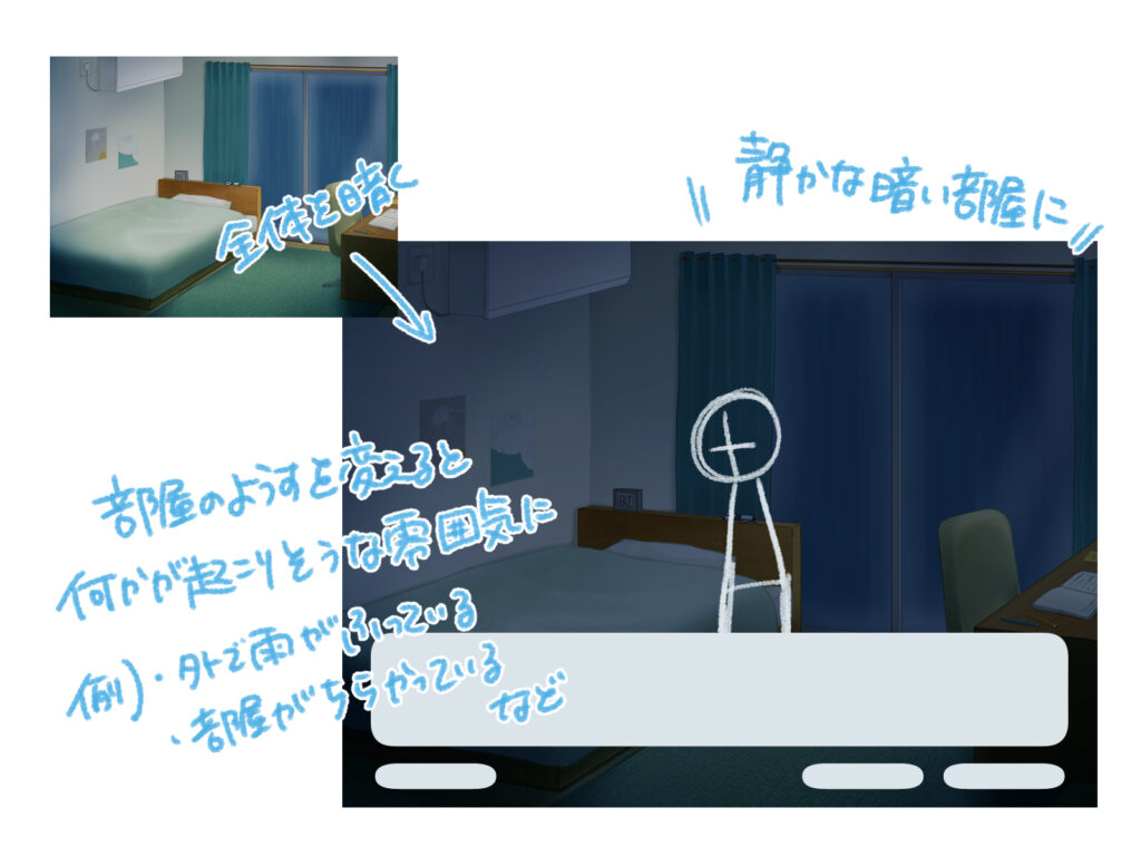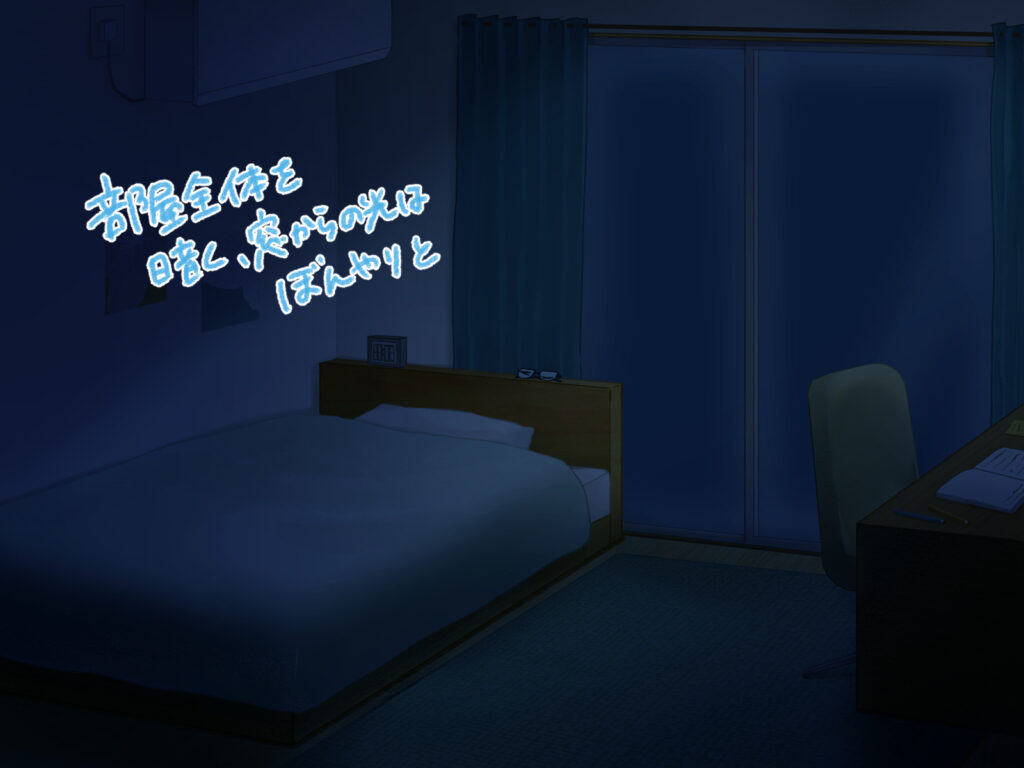 同じ部屋の背景でも、色使いや描き込みを調整するだけで、異なる時間帯や天候を表現でき、物語の演出に幅が生まれます。