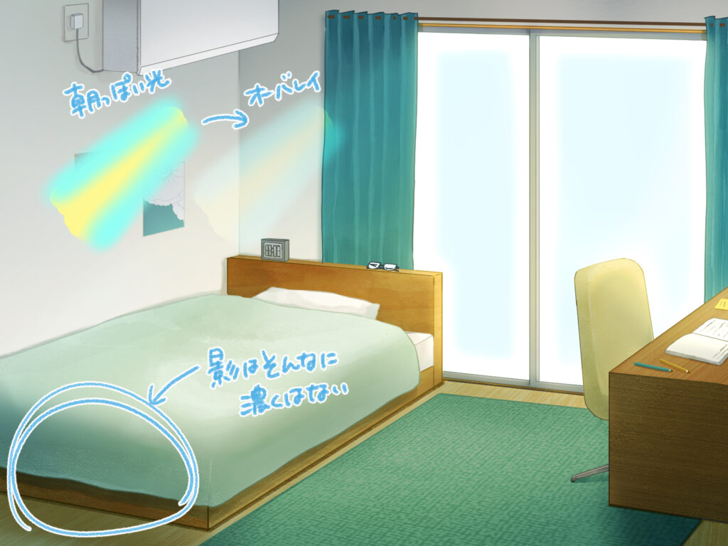 朝の時間帯を表現する場合には、全体的に影を薄めにし、黄色や水色を使った爽やかな光で表現します。