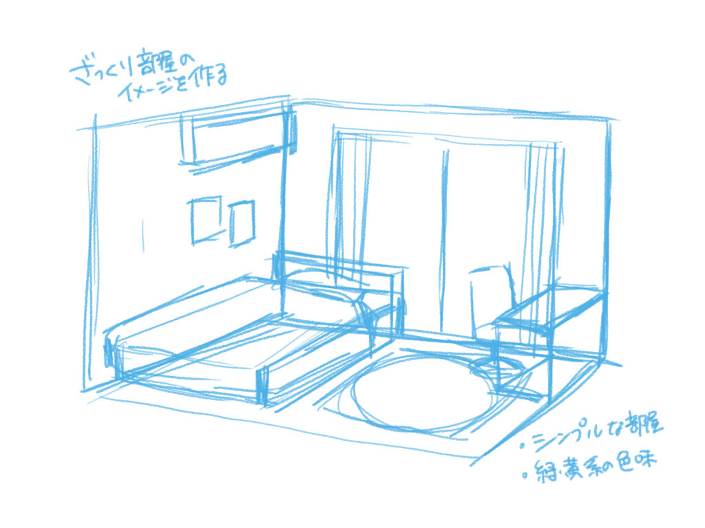 まず、描きたい部屋のイメージを、大きな窓が欲しい、家具はベッドと机だけ、のように具体的に固めます。