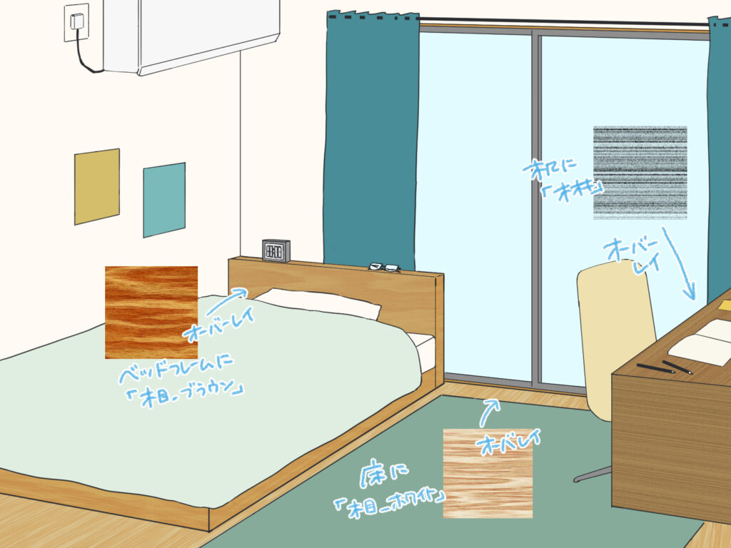 木製の家具には、テクスチャを貼り付けることで質感を簡単に表現することができます。レイヤー効果をオーバーレイにして不透明度を調整して質感を表現しましょう。詳しい使い方は、オーバーレイの使い方の記事をご参照ください。