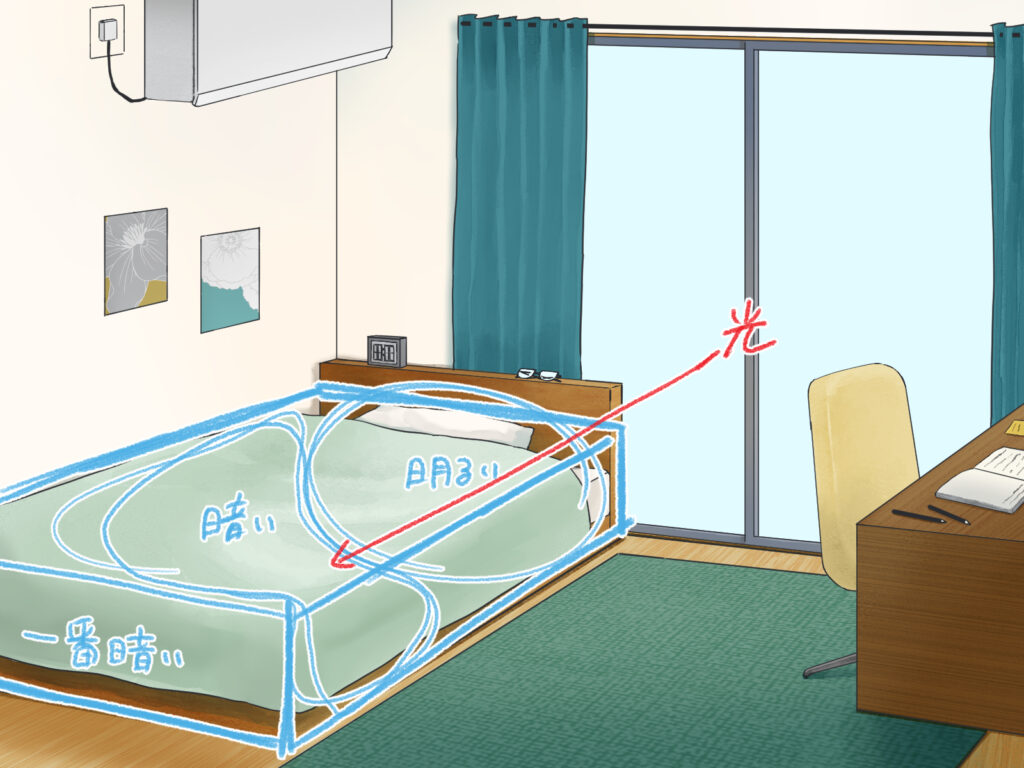光が当たっている床や壁にも、ふんわりと暖かい色を乗せると、よりリアルな雰囲気になります。