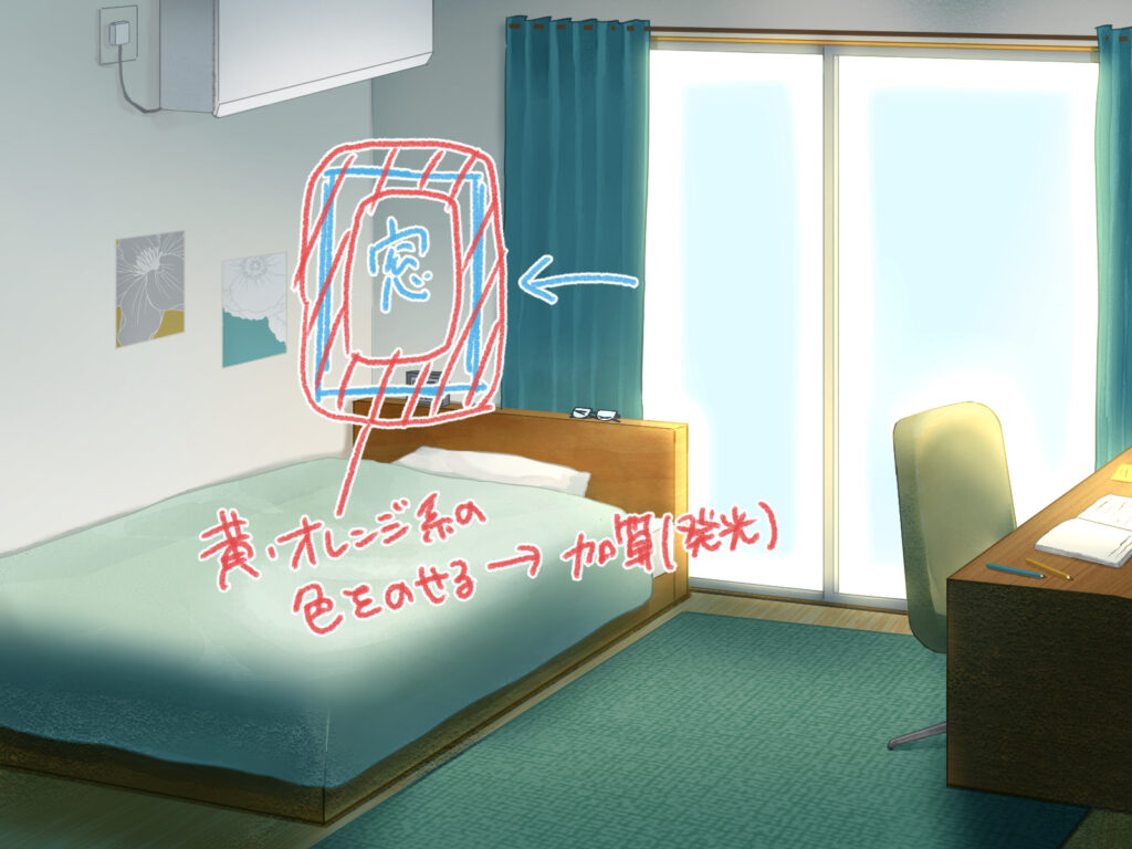 窓枠の周りに黄色やオレンジ系の明るい色を置き、レイヤー効果を「加算(発光)」などにすると、昼間の強い日差しを表現できます。
