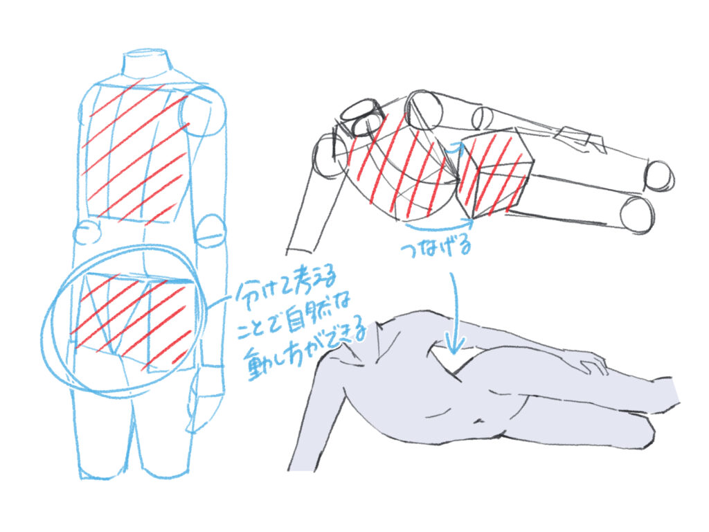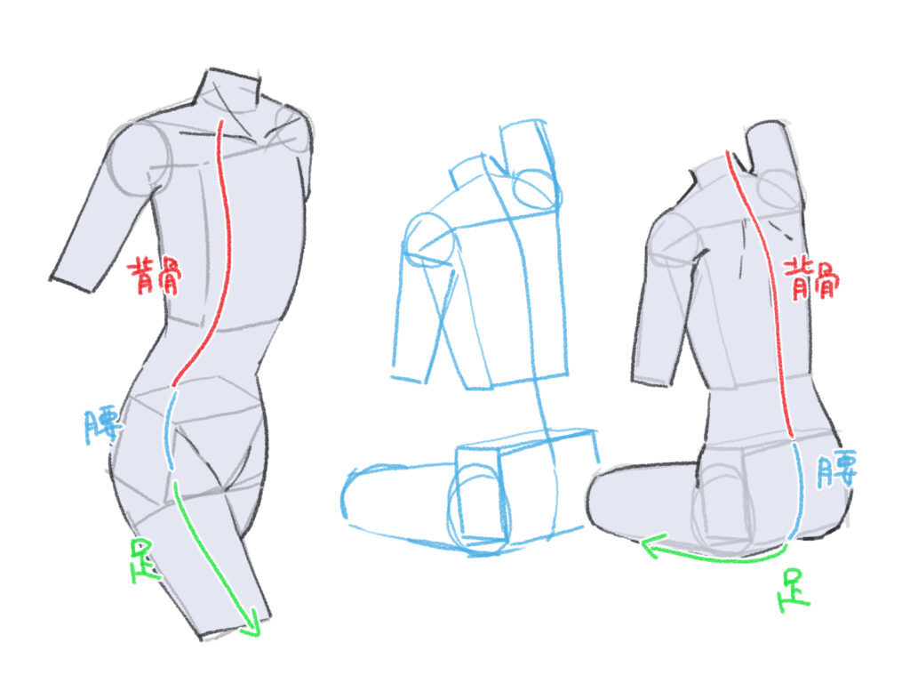 腰は上半身と下半身をつなぐ、人体の中でも特に重要なパーツです。アタリをいくつかのブロックに分けて考えると、自然な動きを描きやすくなります。また、ブロックで捉えることで、腰の傾きや角度も直感的に調整しやすくなります。