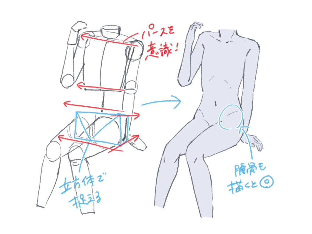 座りポーズの時も立方体を意識して描いていきましょう。正面から見たパースだけでなく、奥行きのパースも意識することで、より立体感のある腰が描けます。