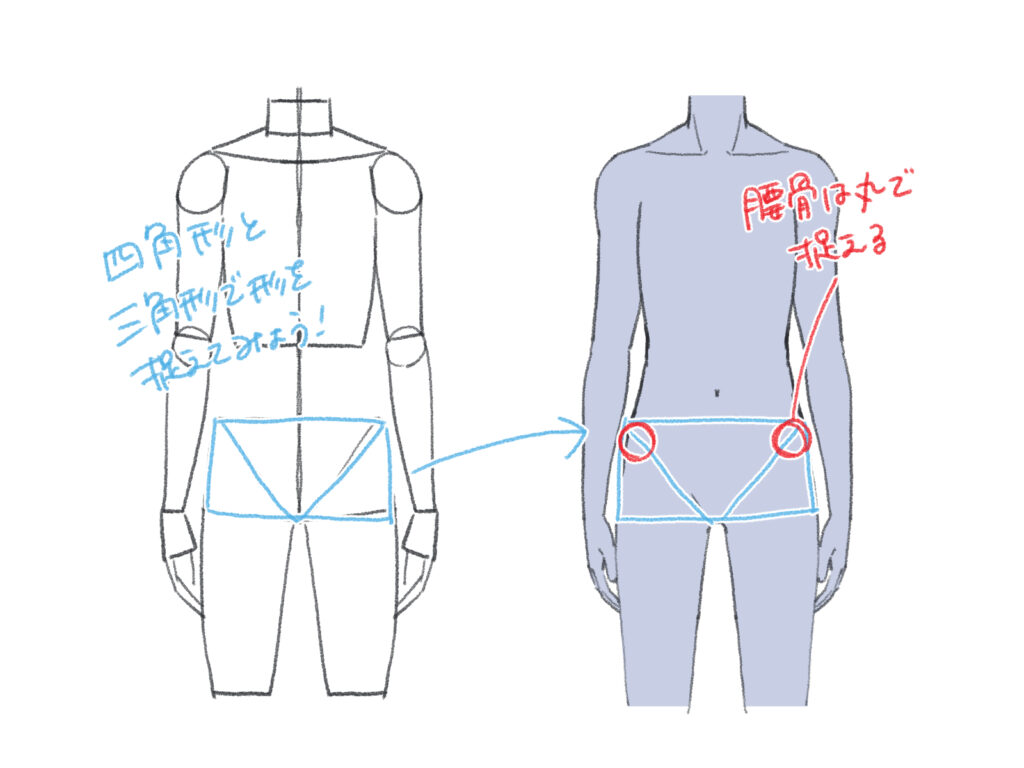 立ちポーズでは、四角形で腰の形のアタリを取ると全体を捉えやすくなります。四角形の上辺に接するように腰骨を意識して丸で捉えておくと、さらに立体的な腰の形が描けます。