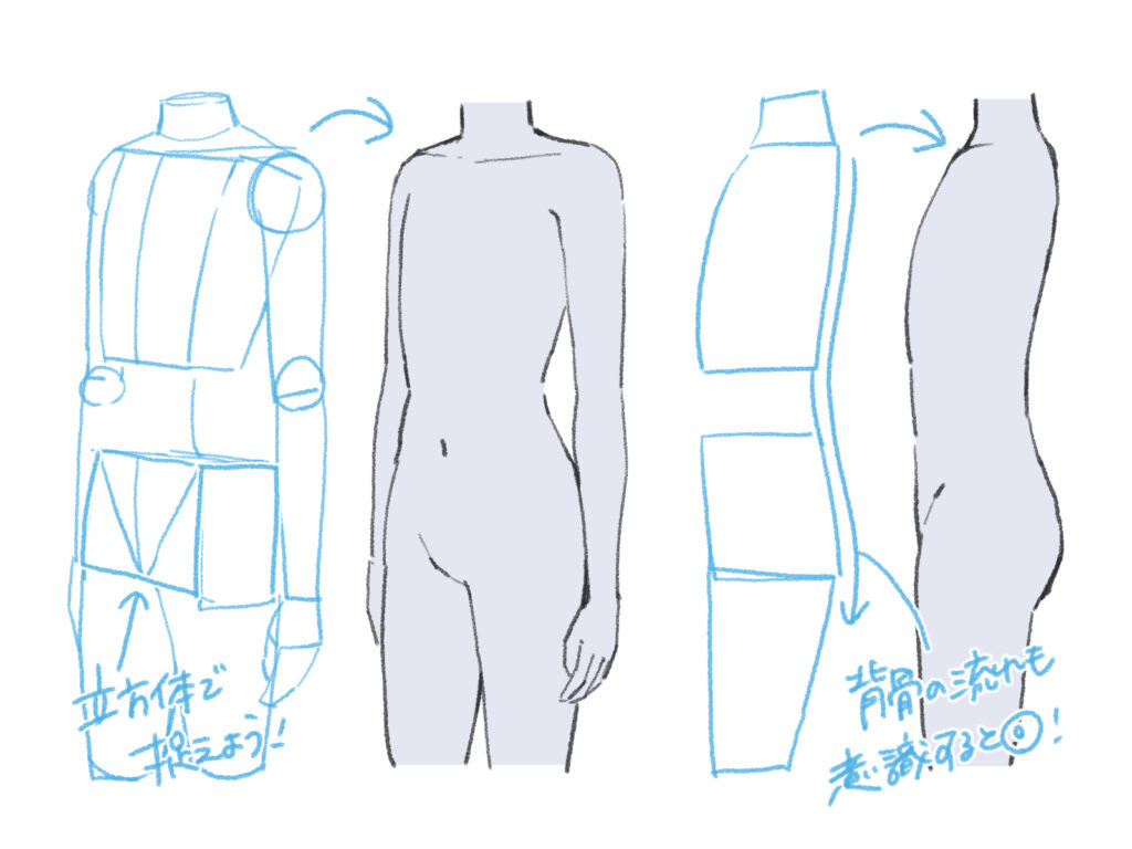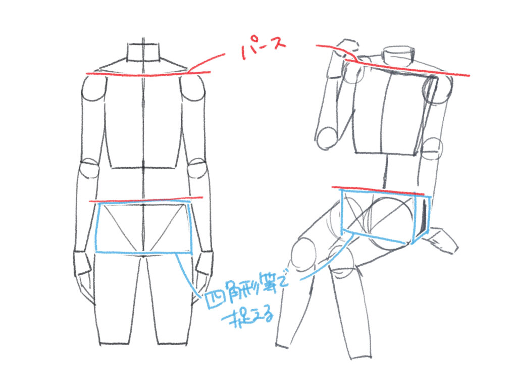 斜めや横からのアングルでも、同様に立方体でアタリを取ります。パースも意識して描くと、より説得力のある腰が描けます。