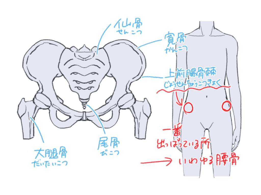 腰を描く上で特に意識したいのが、骨盤の正面にある「上前腸骨棘(じょうぜんちょうこつきょく)」です。これは、腰に手を当てたときに触れる、正面の出っ張った骨のことです。