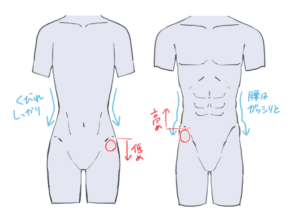 男女の体格差を描き分けるには、くびれや腰の位置に注目することがポイントです。