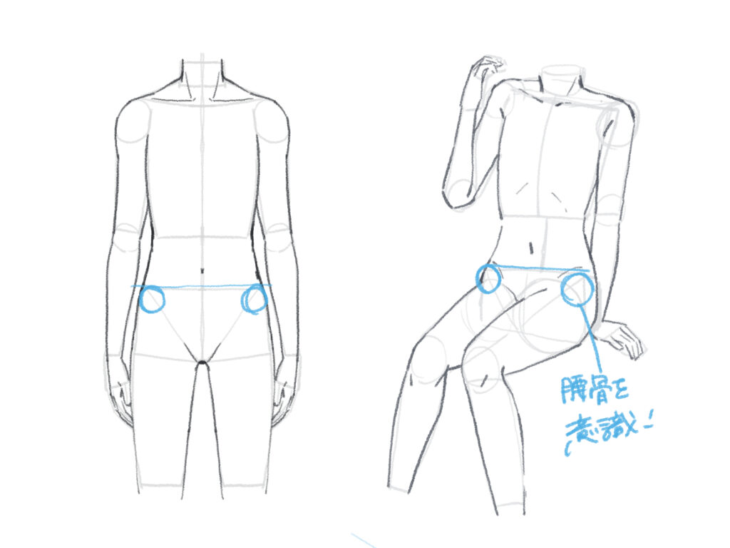 この骨を目印にすると、腰の位置や傾きが正確に描けるようになります。ぜひ覚えておきましょう。
