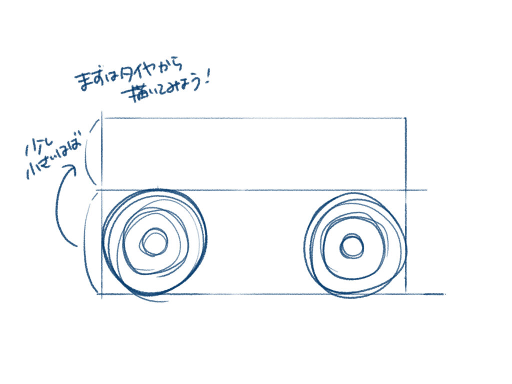 横から見た構図なら、タイヤを一つ描いてコピー&ペーストすると時短になります。
