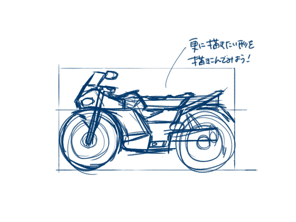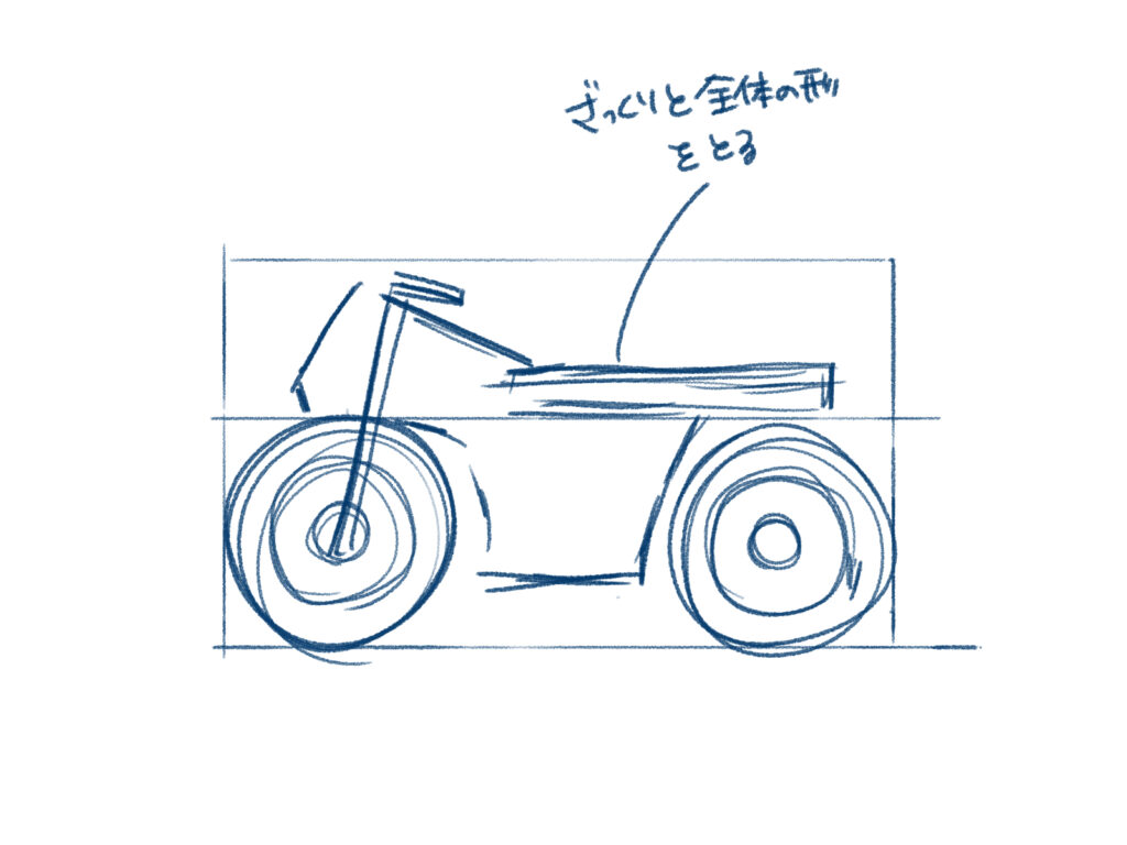 長方形の形をガイドラインにして、描きたいバイクの全体像をざっくりと描いていきます。