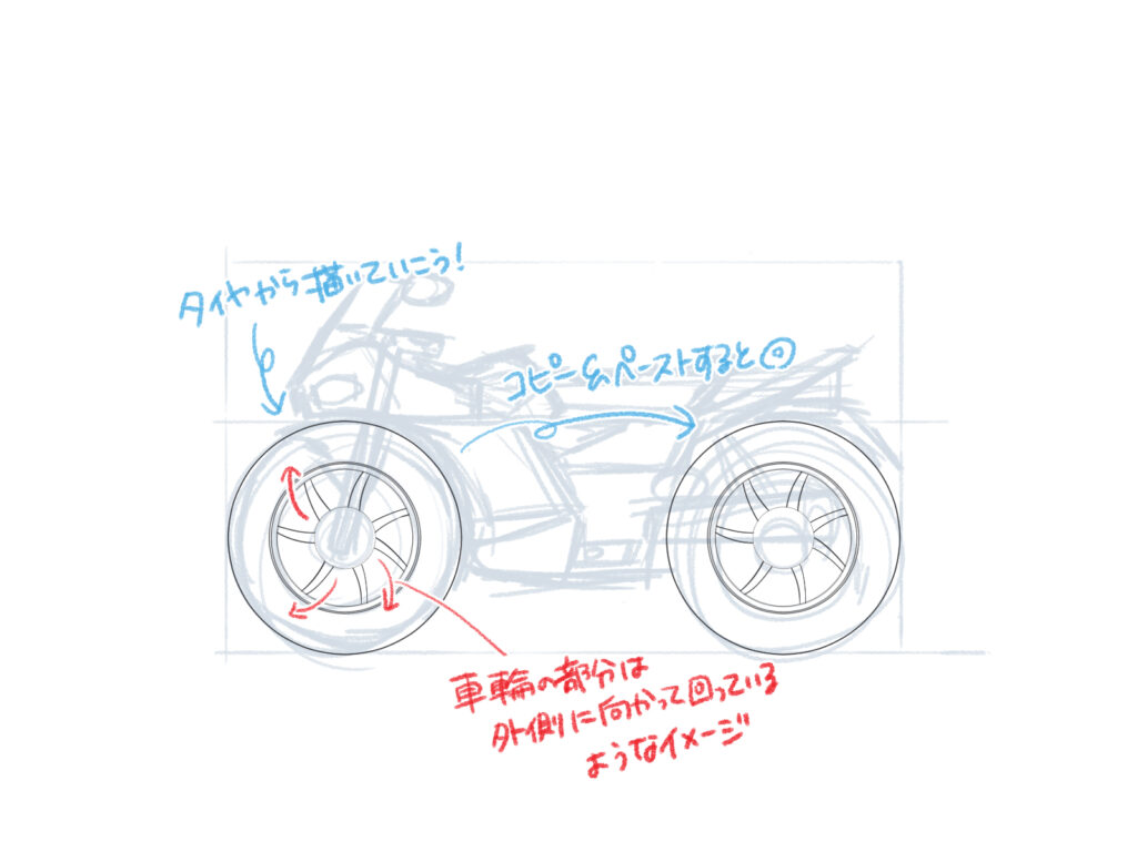 バイクによっては機械部分がよく見えるデザインのものもあります。描きたいバイクをよく観察して、メカニカルな部分を描き込むと、よりリアルな仕上がりになります。
