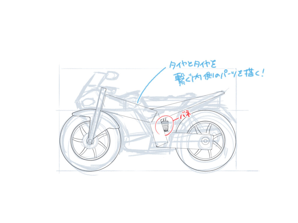 タイヤとタイヤを繋ぐ、エンジンなどの内側のパーツを描いていきます。