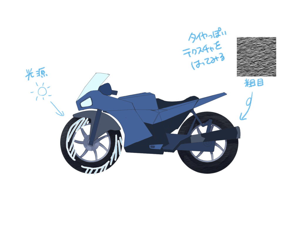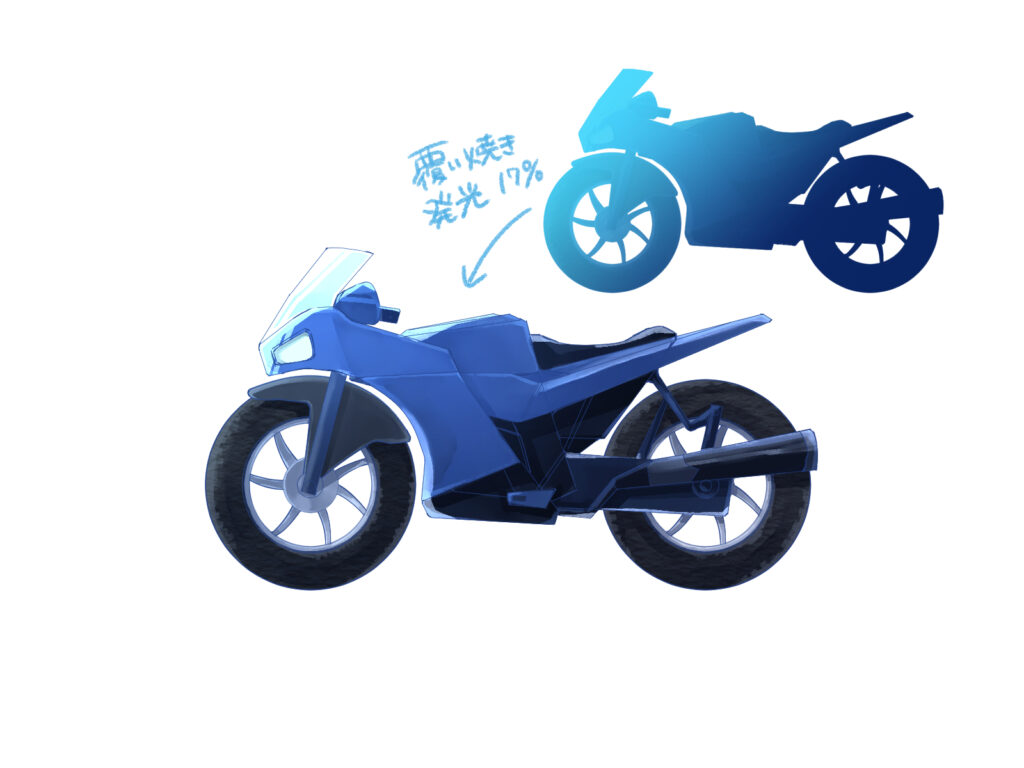最後に、仕上げに光を入れていきます。バイクの車体は金属でできていることが多いので、ツヤっとした質感を意識するのがポイントです。