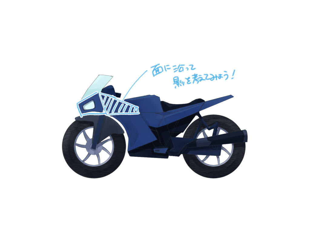 バイクを描く時は、ハンドル・シート・タイヤ・ステップ・マフラーといったバイクらしいパーツさえ描けていれば、バイクらしく見えます。完璧を目指さず、まずはこれらのパーツを描くことを意識してみましょう。