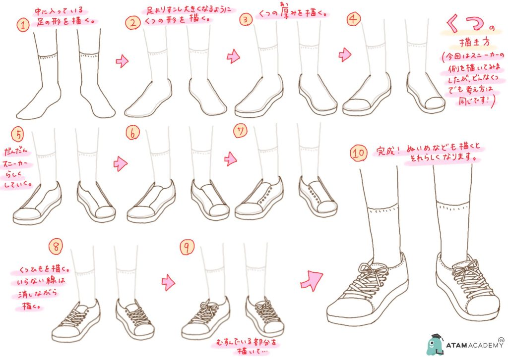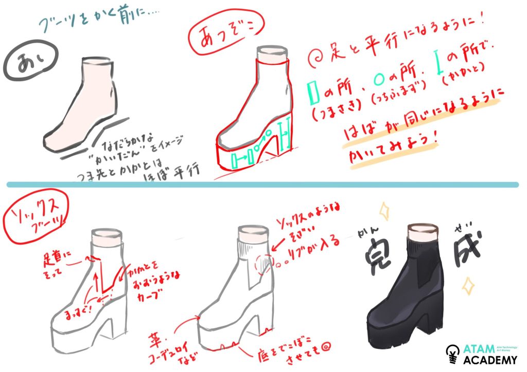 アタムアカデミーでは、靴の描き方を学ぶことができます。