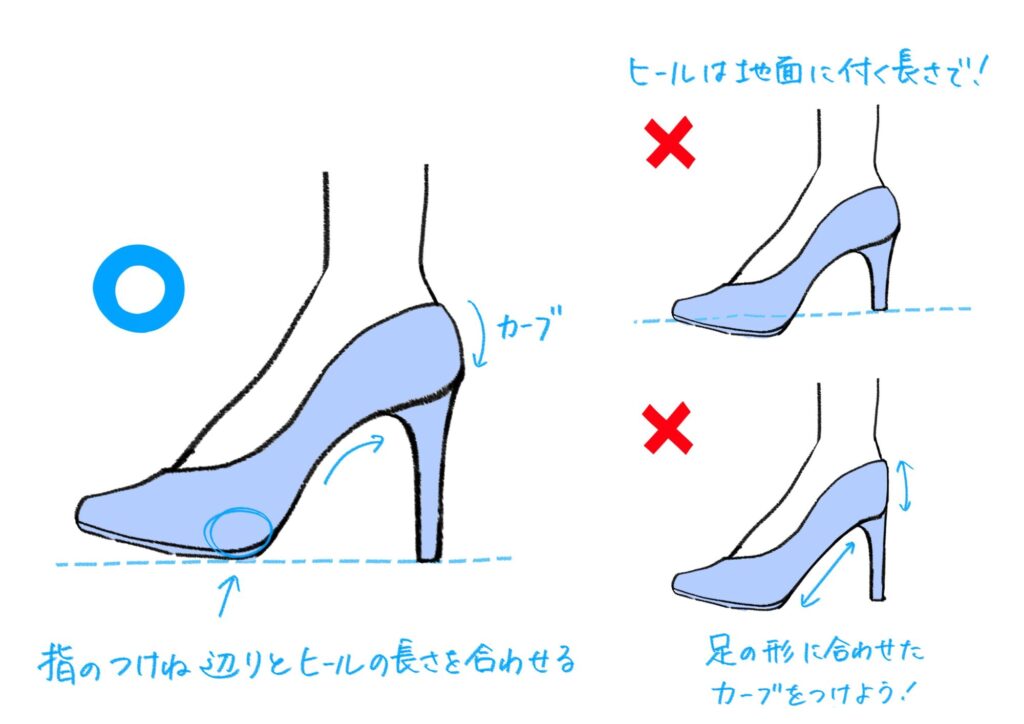 ヒールの詳しい描き方は、「初心者も簡単!ヒールのイラストの描き方」の記事を参考にしてください。