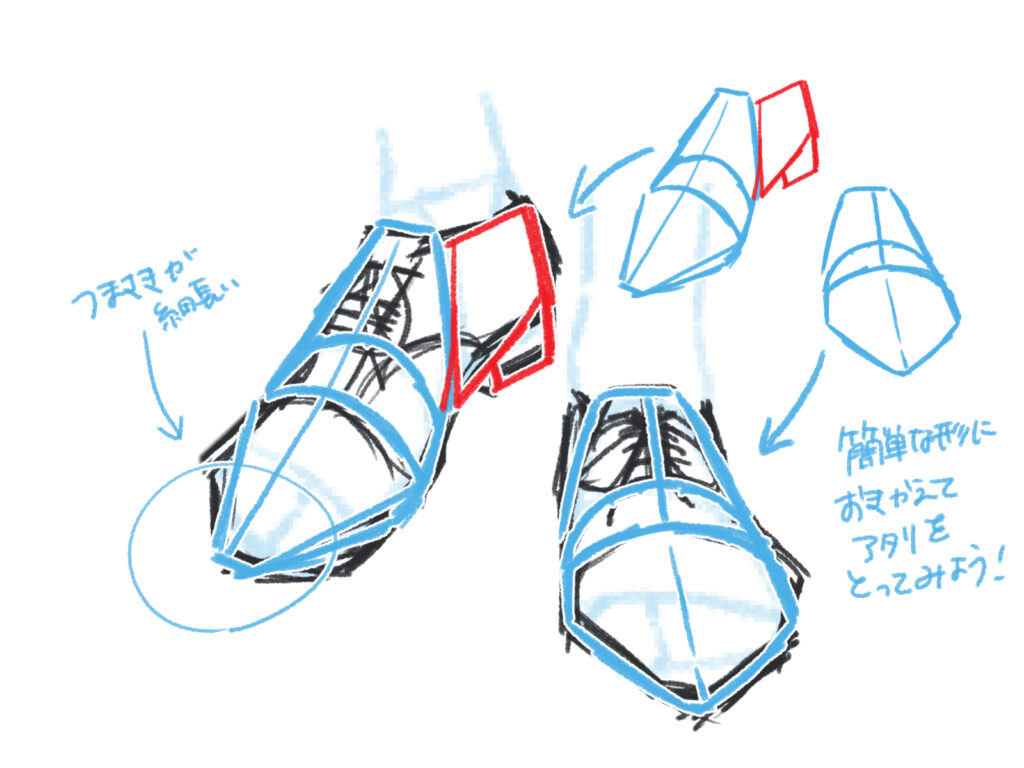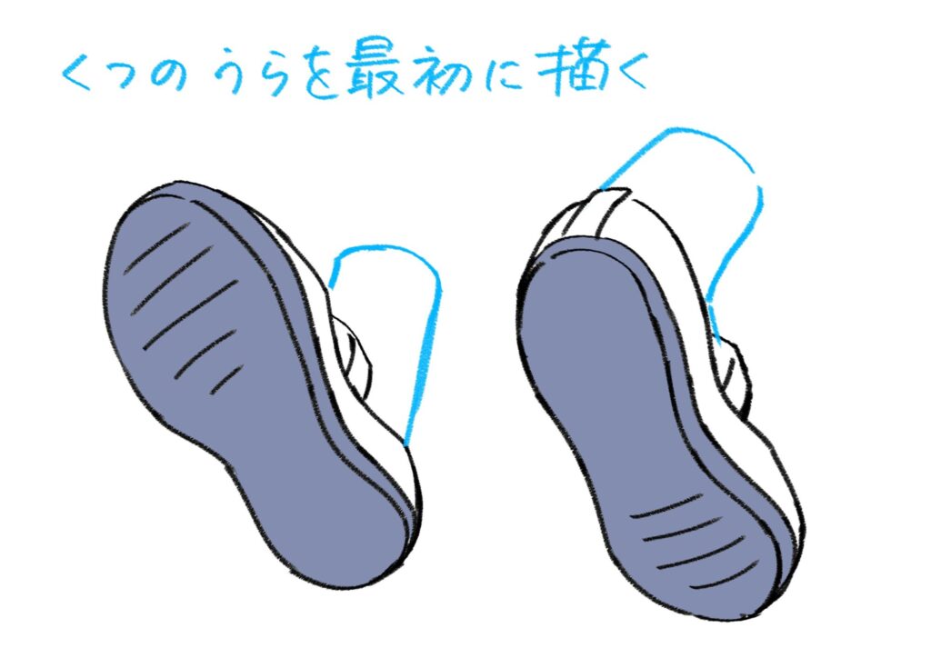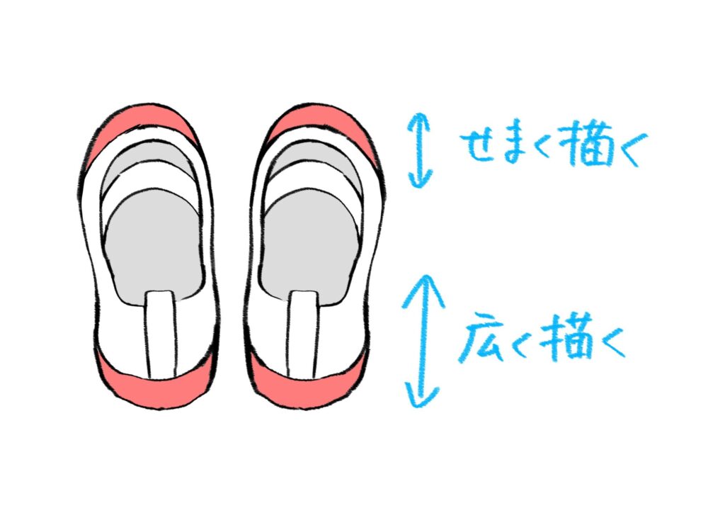 靴を後ろから描くときは、かかとを少し広めに描くと安定感が出ます。逆につま先のパーツは少し狭く描くと、前後の違いがはっきりします。
