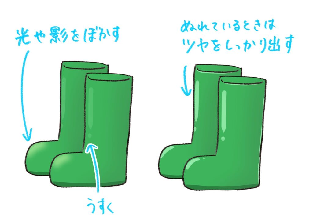 ゴムは、光がぼんやりと当たっているのが特徴です。光や影を入れた後に「ぼかしツール」で少しぼかすと、しっとりとした質感になります。逆に、雨に濡れた様子を表現したいときは、光の反射をはっきりと描くと、濡れたゴムらしさが出ます。