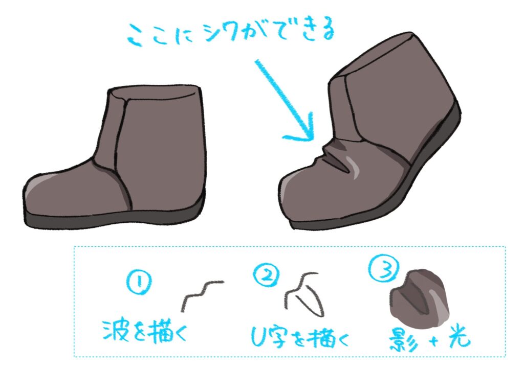 靴には、歩くときに足が曲がる場所、特に「つま先と甲の間」にシワができやすいです。以下の手順で描いてみましょう。