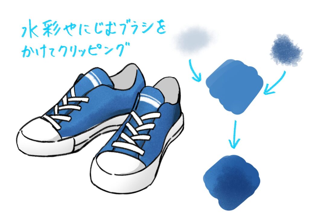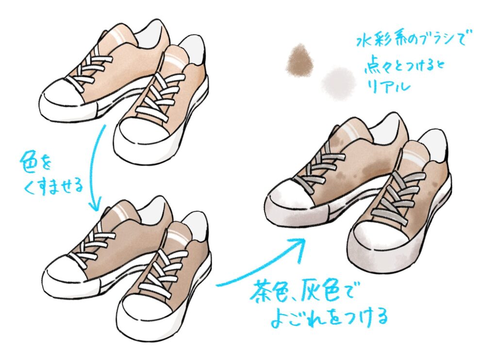 使い古した靴を描くときは、まず全体の色を少しだけくすんだ色調にしましょう。その上から、茶色や灰色の汚れを付け加えていきます。水彩系のブラシを使い、点々とまばらに色を乗せ、特に汚れやすい靴底やつま先を中心に汚すのがポイントです。