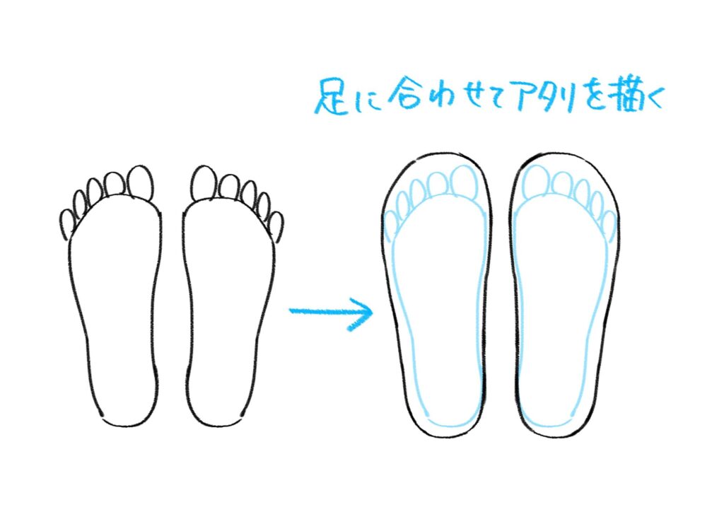 はじめにアタリを描きます。いきなり靴を描くのではなく、まず足の形を描き、その形に沿って靴のシルエットを重ねるように描いていきましょう。靴のアタリは実際の足よりも少し大きめに描くと、自然な仕上がりになります。
