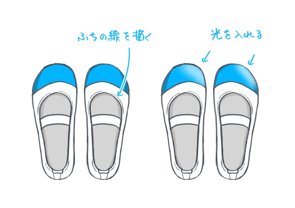 仕上げに、履き口の周りにもう一度線を入れて、少し厚みを表現します。最後に、つま先に白い光をふんわりと入れると、ゴムのつやつやとした質感が出て、よりリアルな靴に仕上がります。