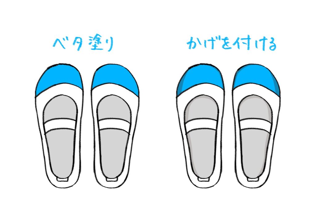 色を塗るときは、まずつま先の部分に好きな色を付けてみましょう。中敷きの部分は薄い灰色で塗ると、影があるように見えて立体感が出ます。