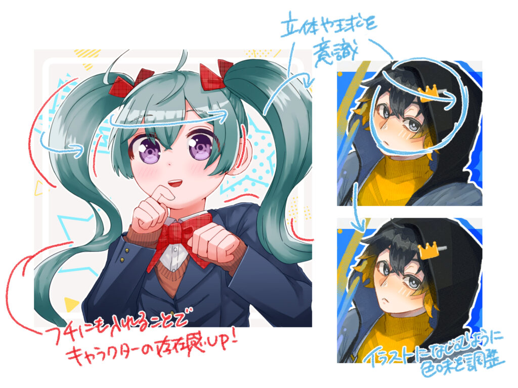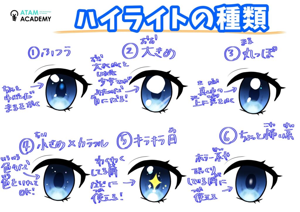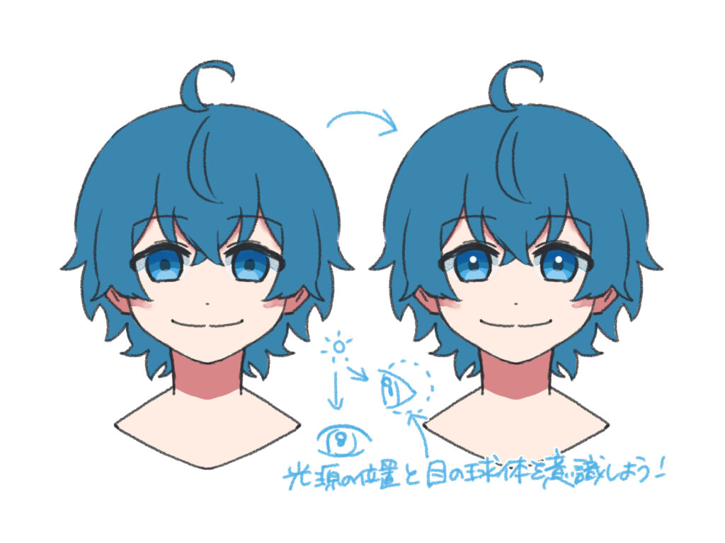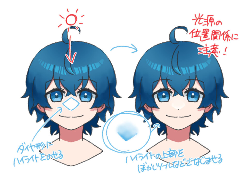 ハイライトの形や入れる場所によってキャラクターの雰囲気が大きく変わるため、クールに見せたいときは小さく、可愛らしく見せたいときは大きく入れるなど、イメージに合わせて工夫してみましょう。