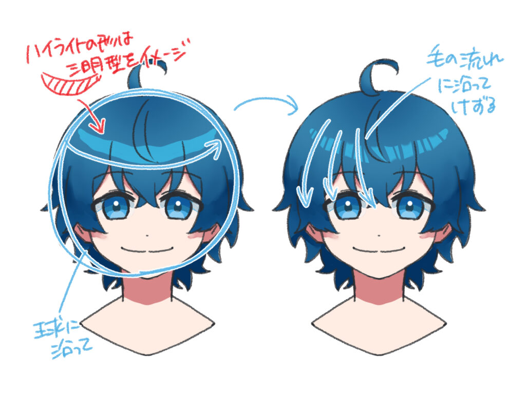髪のハイライトは、頭の形(球体)と光源の位置を意識するのがポイントです。ここでは、基本的な描き方をご紹介します。