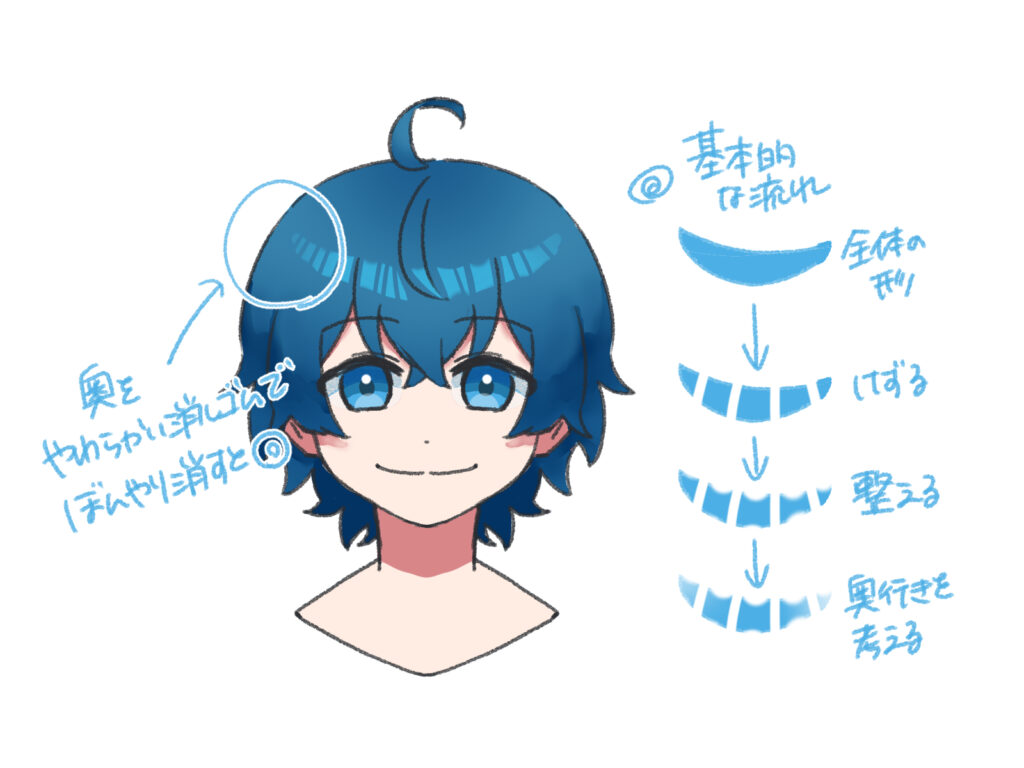 次に、髪の流れを意識しながら、消しゴムで削ります。この流れで描くと、初心者でも簡単に入れられます。
