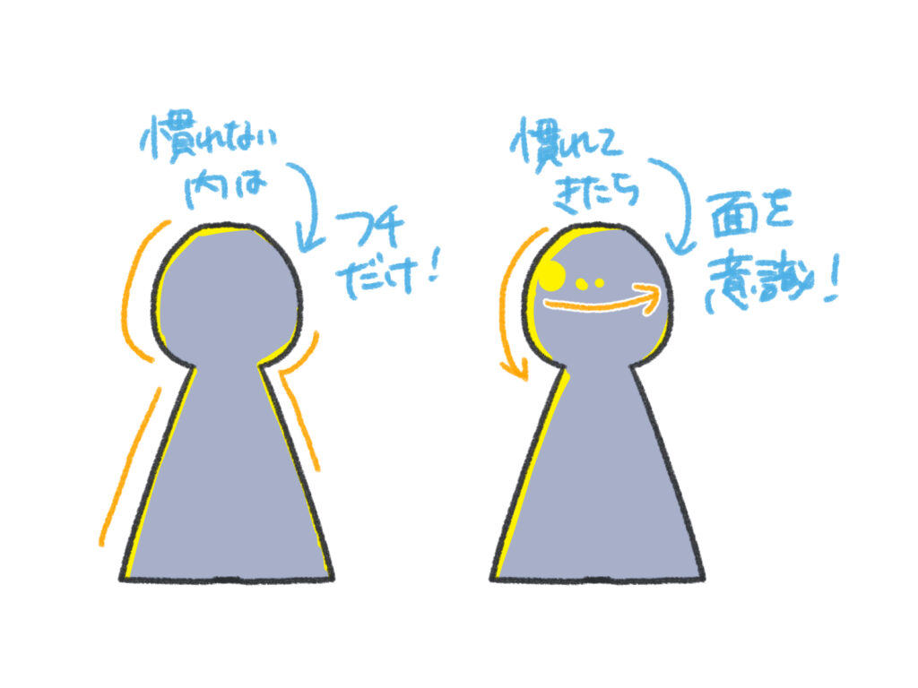まず、頭の丸みに沿って、ハイライトの全体の形を塗りましょう。三日月形をイメージするといいでしょう。