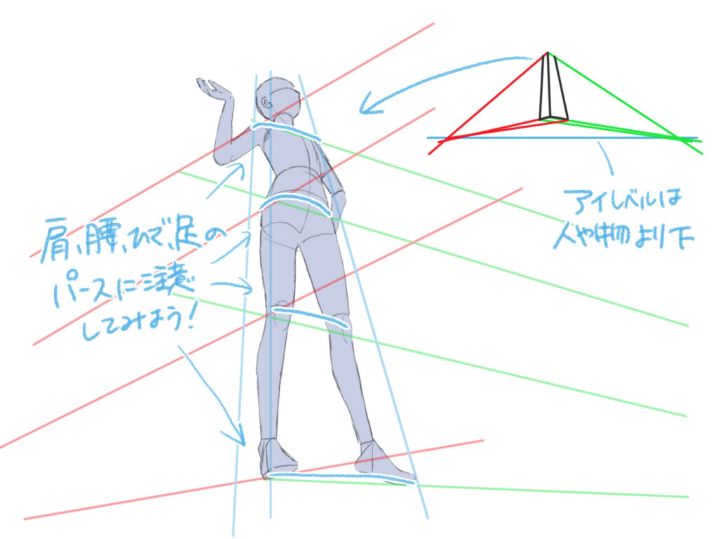 肩、腰、膝、足のラインがパース線に乗るように意識しつつ、奥行きを表現することで、迫力のあるアオリ構図になります。